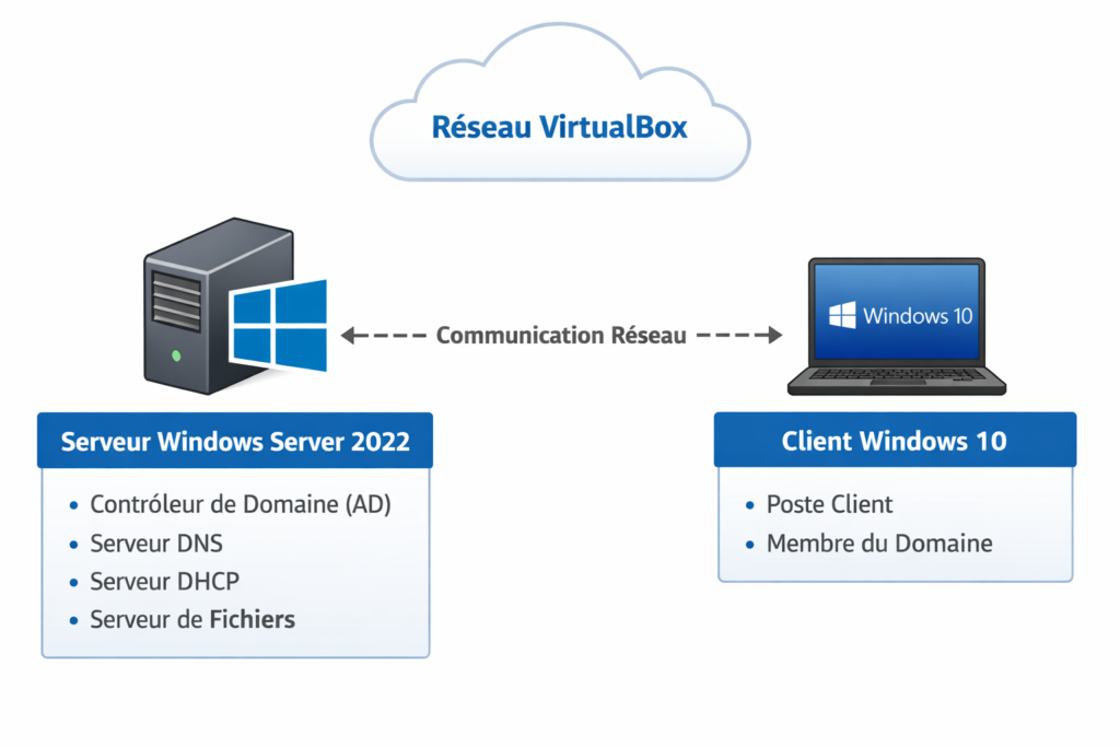 Configuration Active Directory, création de gpo, DHCP, DNS, serveur de fichier